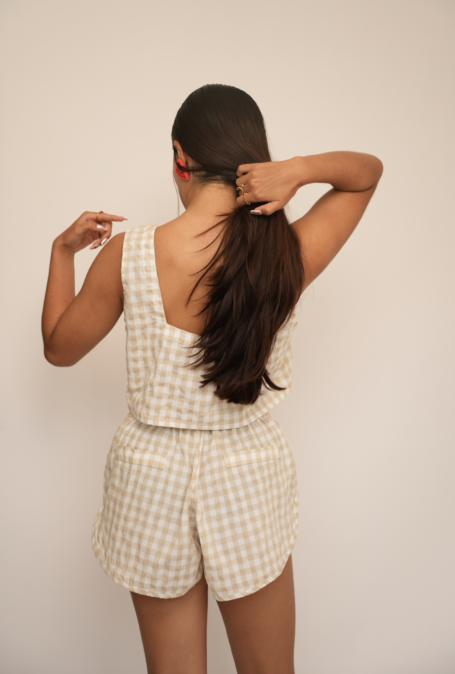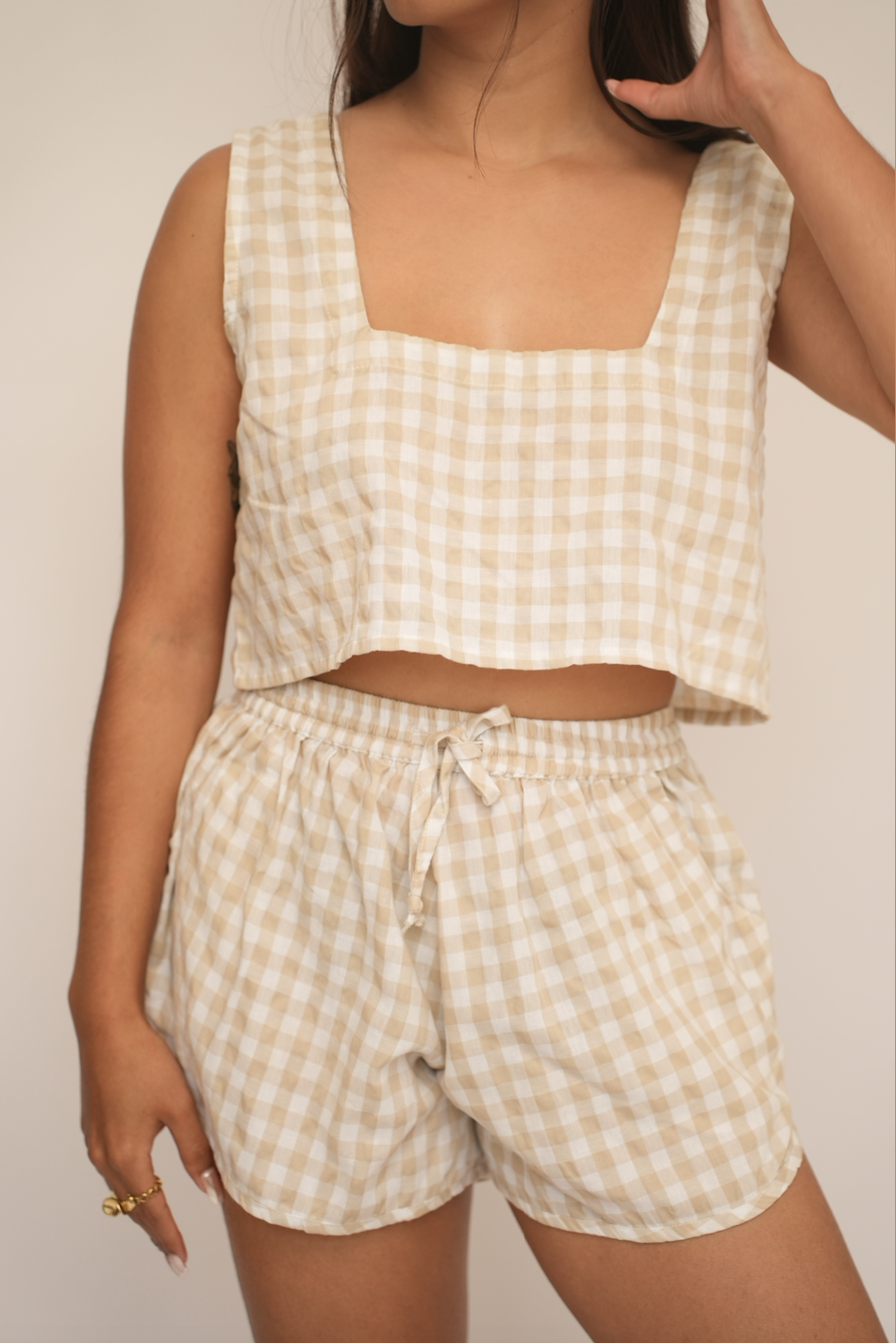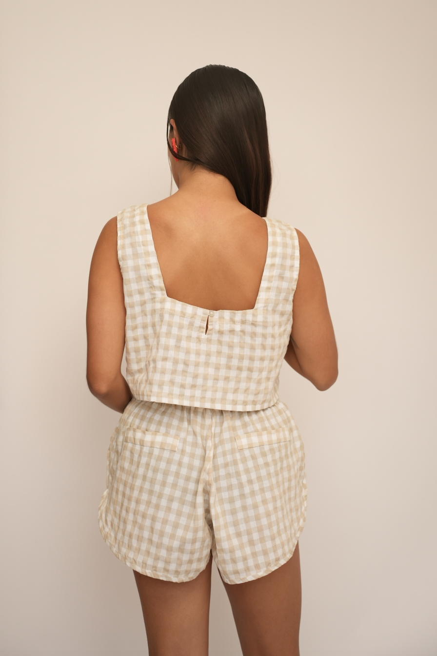 Set de dos piezas con estampado de cuadros en tonos beige y blanco. Hecho de 100% algodón, ideal para climas cálidos gracias a su frescura y comodidad. El short es talla S/M con ajuste de lazo en la cintura.